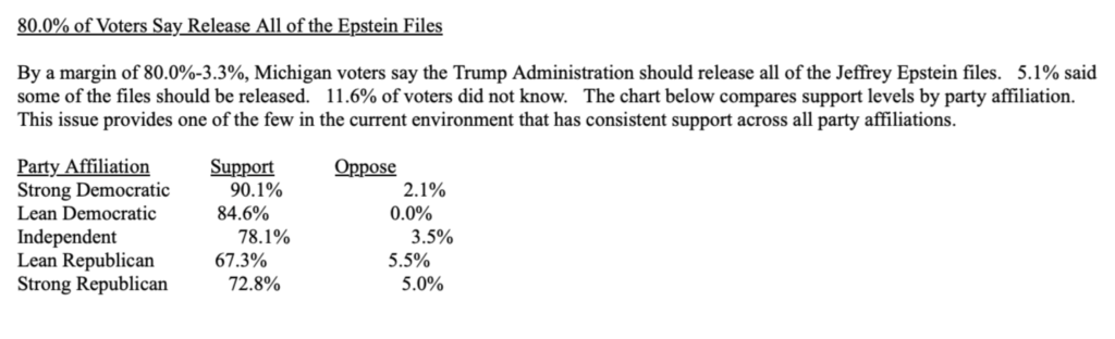LANSING, MI – Today, the Michigan AFL-CIO released polling that reveals a supermajority of Michigan voters want all the Epstein files released. Polling conducted by the Glengariff Group on behalf of the Michigan AFL-CIO found that by a margin of 80-3 percent, Michigan voters want the Trump regime to release all the Epstein files. This includes over 72 percent of strong Republican and 78 percent of Independent voters.